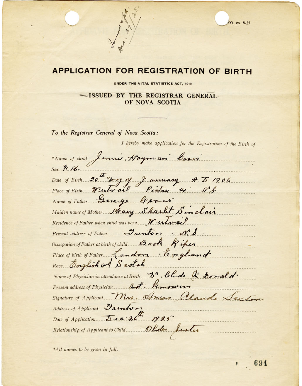 IN THE MATTER of the application for the Registration of the Birth of Jennie HaymanCross