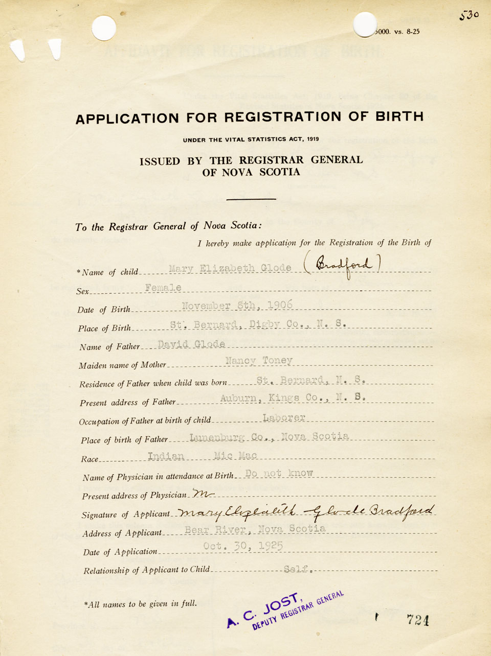 Signature of Applicant Mary Elizabeth Glode Bradford Address of Applicant Bear River Date 30 October 1925