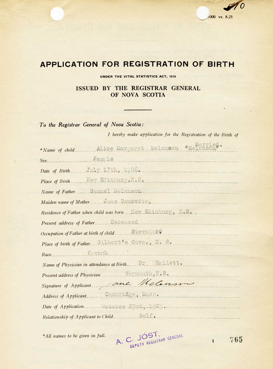 I hereby make application for the Registration of Birth of Alice MargaretMelanson Sex Female