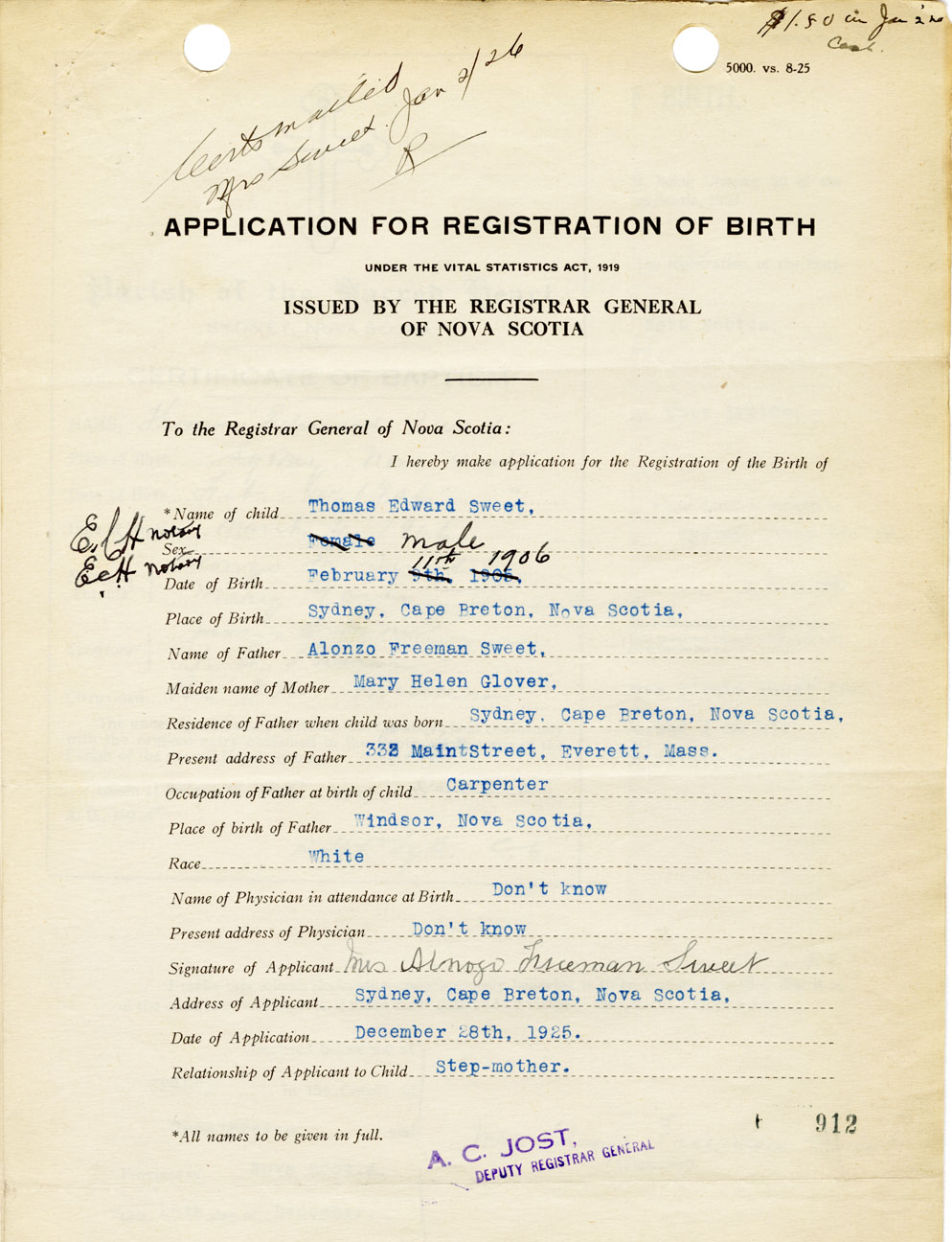 I hereby make application for the Registration of Birth of Thomas EdwardSweet Sex Male