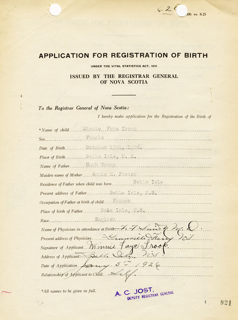 I hereby make application for the Registration of Birth of Minnie FayeTroop Sex Female