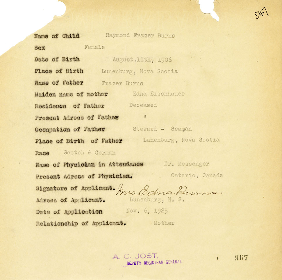 Date of Birth August 11, 1906 Place of Birth LunenburgCounty of Lunenburg