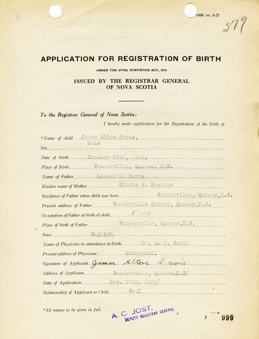 I hereby make application for the Registration of Birth of James AltonDavis Sex Male