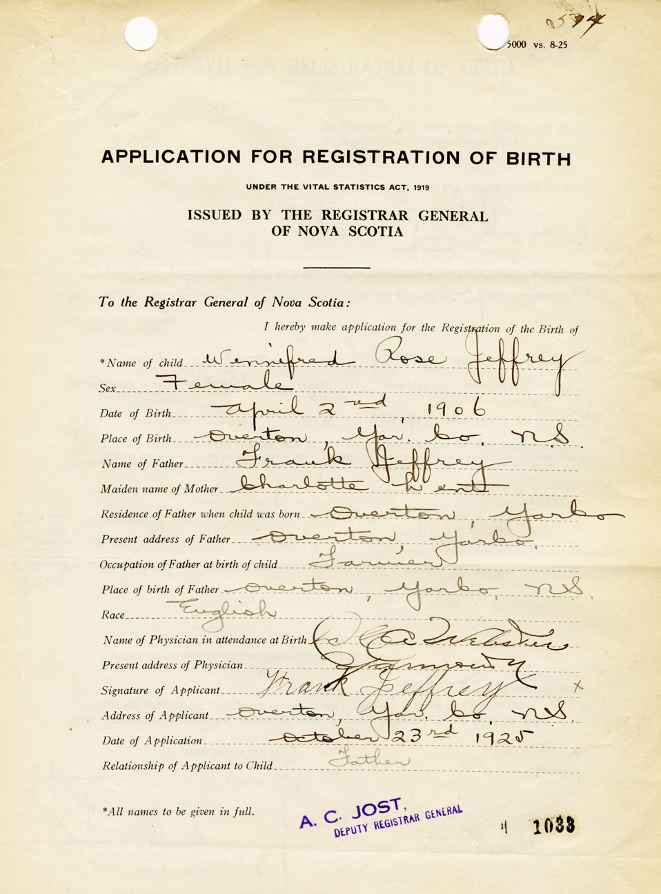 I hereby make application for the Registration of Birth of Winnifred RoseJeffrey Sex Female