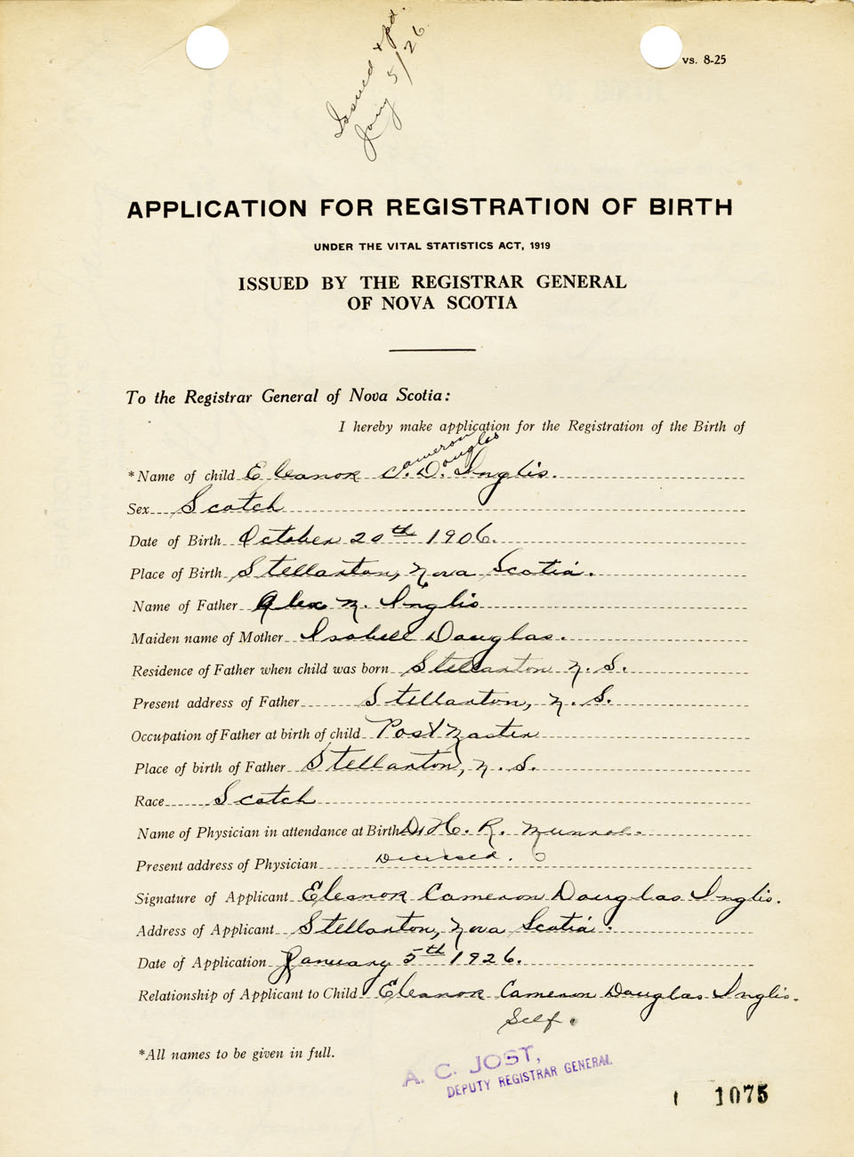 Signature of Applicant Eleanor Cameron Douglas Inglis Address of Applicant Stellarton Date 5 January 1926