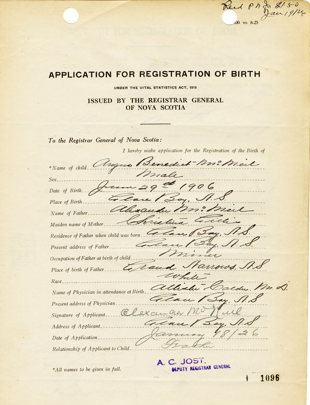 I hereby make application for the Registration of Birth of Angus BenedictMcNeil Sex Male