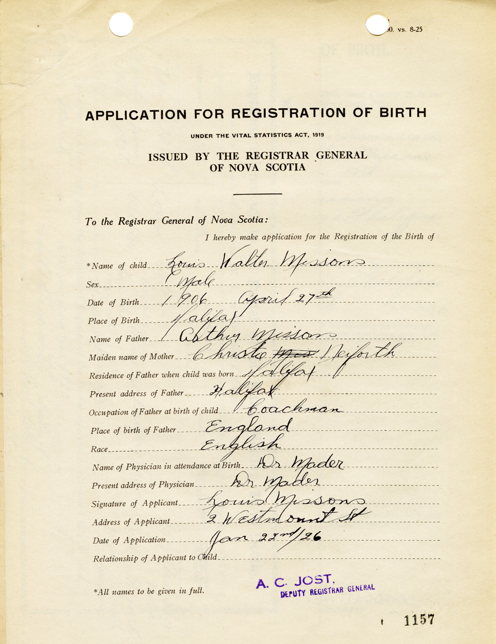 Signature of Applicant Louis Missions Address of Applicant Halifax Date 22 January 1926