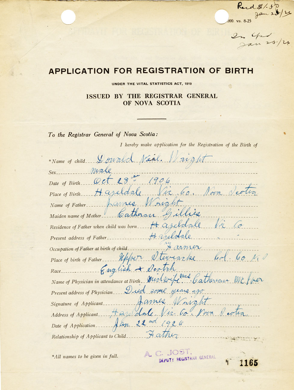 I hereby make application for the Registration of Birth of Donald NeilWright Sex Male
