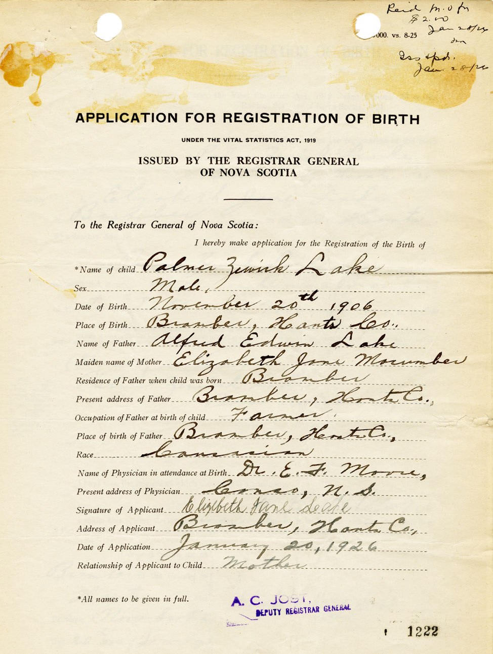 I hereby make application for the Registration of Birth of Palmer ZewickLake Sex Male