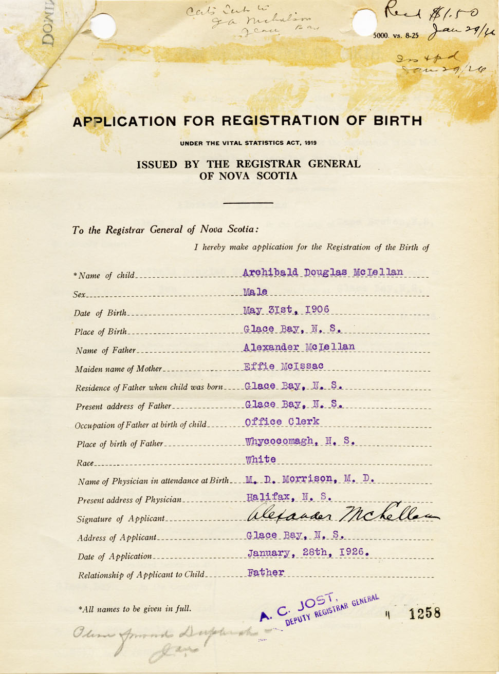 I hereby make application for the Registration of Birth of Archibald DouglasMcLellan Sex Male