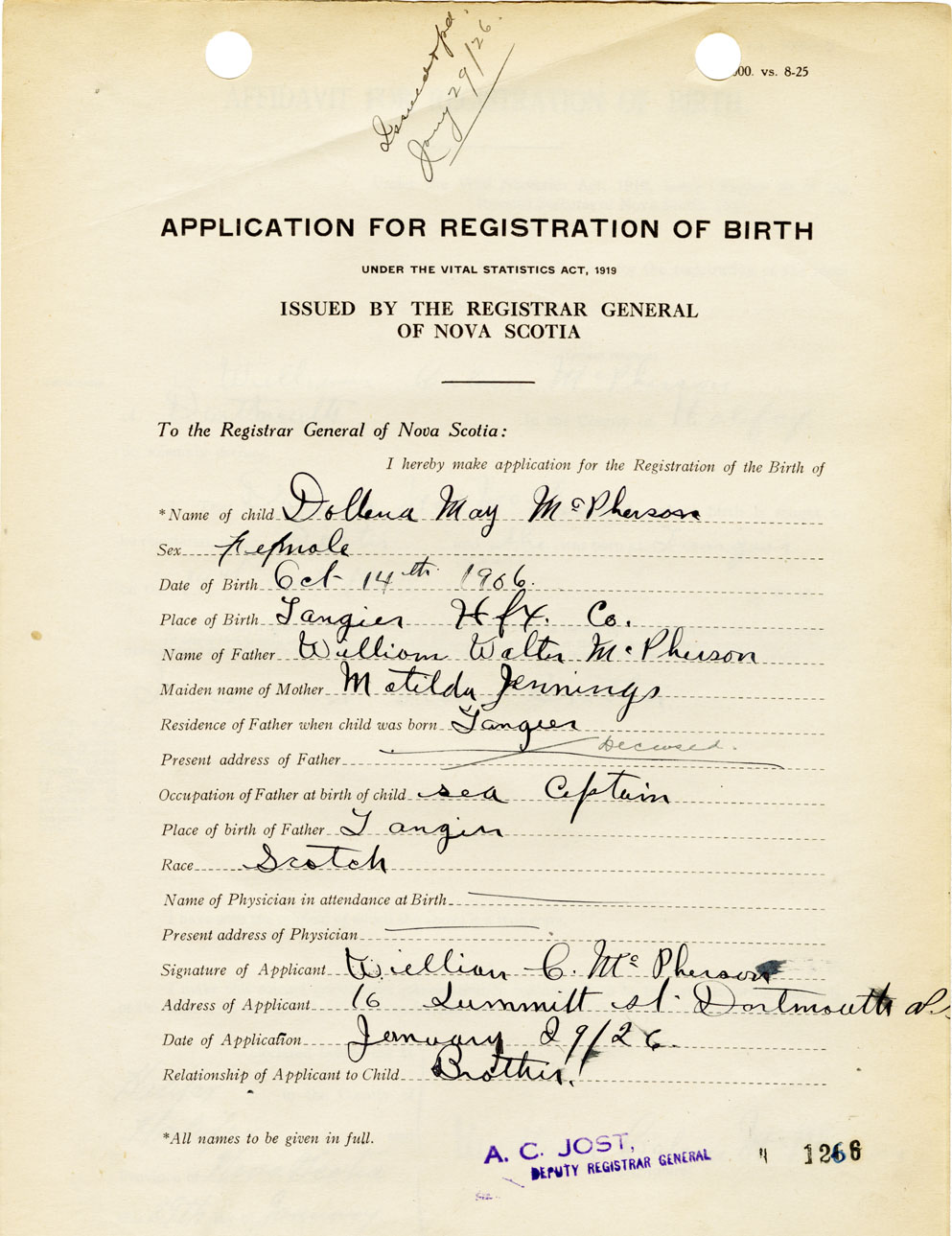 I hereby make application for the Registration of Birth of Dollena MayMcPherson Sex Female