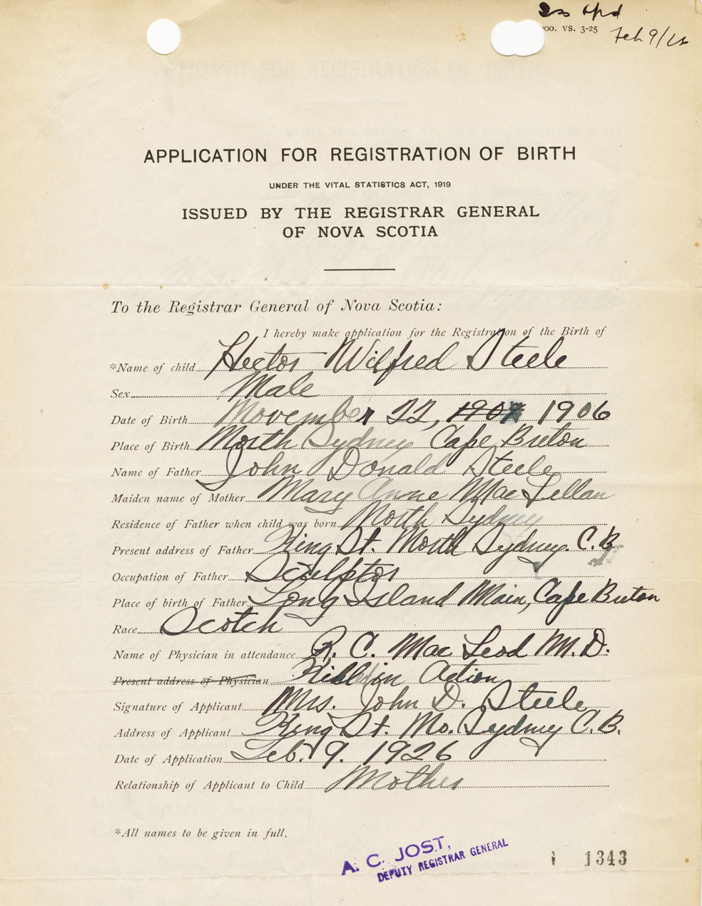 I hereby make application for the Registration of Birth of Hector WilfredSteele Sex Male