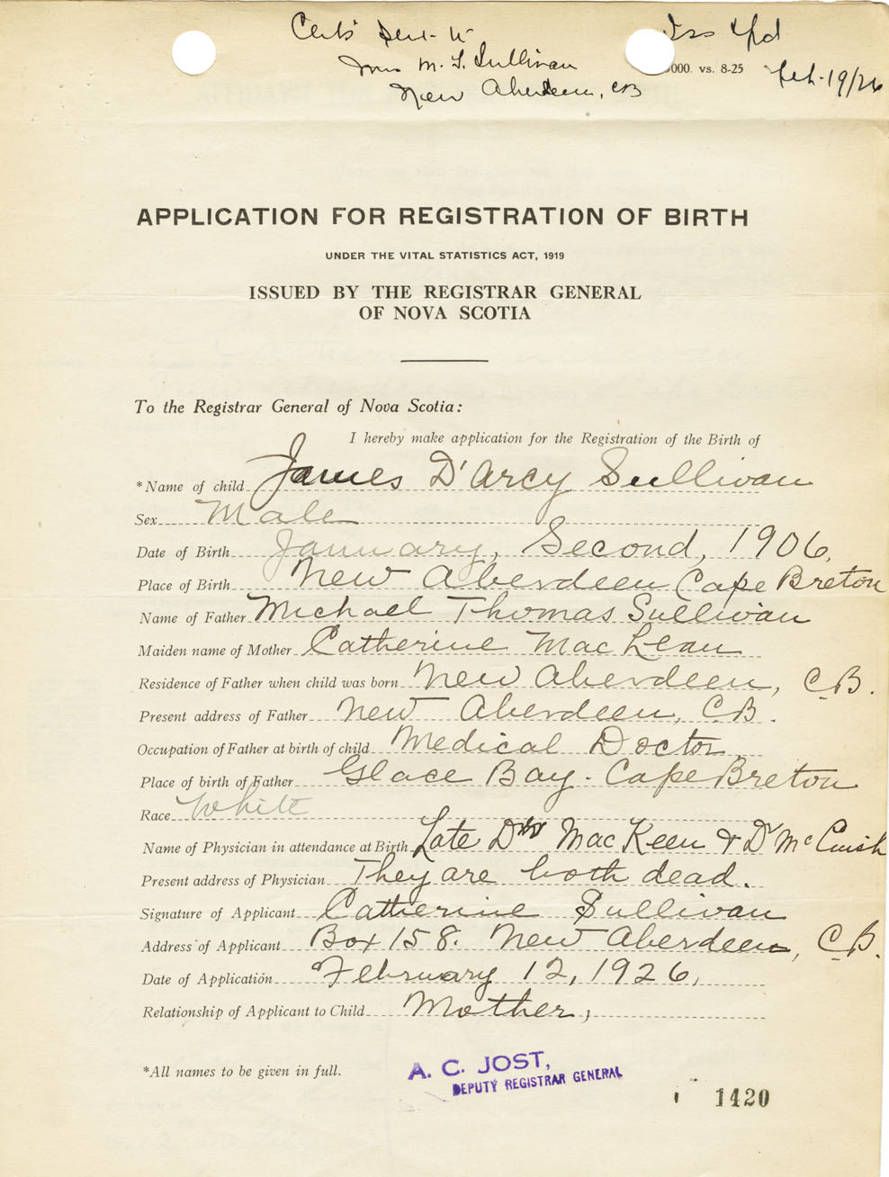 Date of Birth January 2, 1906 Place of Birth New AberdeenCounty of Cape Breton