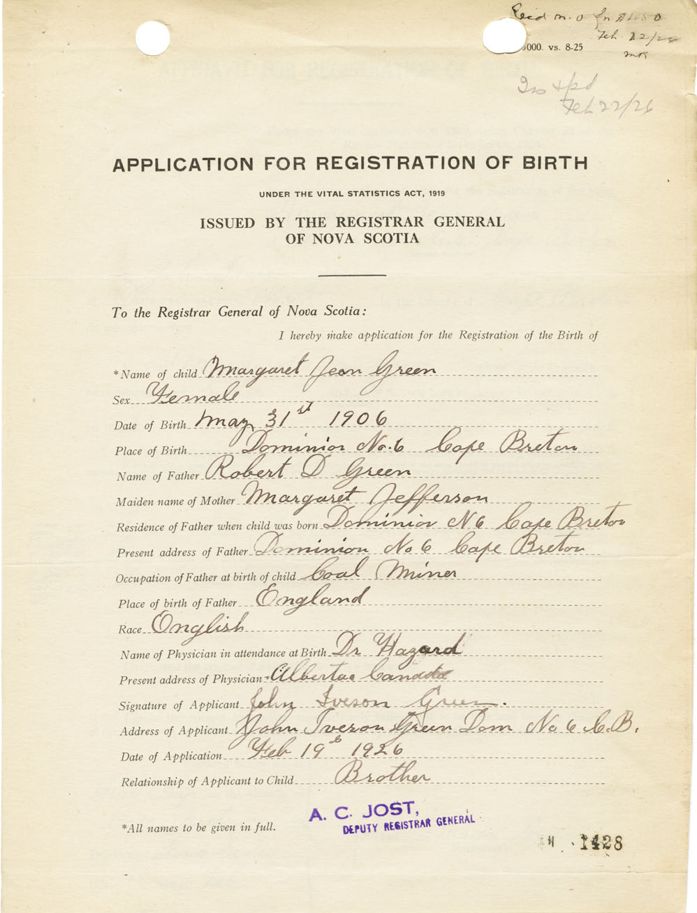 Date of Birth May 31, 1906 Place of Birth DominionCounty of Cape Breton