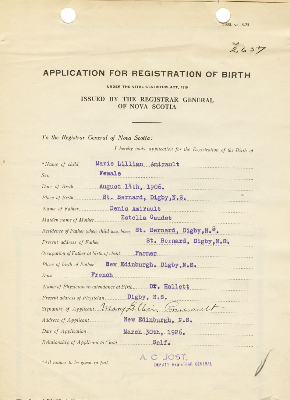 I hereby make application for the Registration of Birth of Marie LillianAmirault Sex Female
