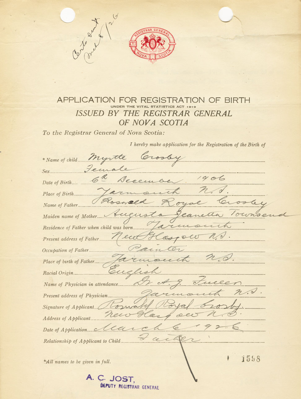 Signature of Applicant Roswald Royal Crosby Address of Applicant New Glasgow Date 6 March 1926