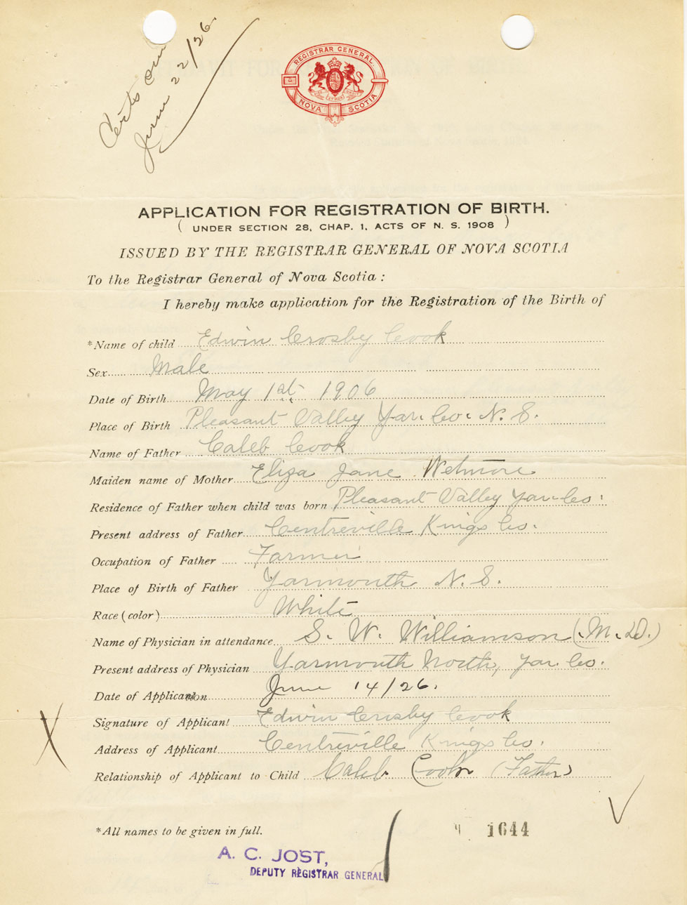 Date of Birth May 1, 1906 Place of Birth Pleasant ValleyCounty of Yarmouth
