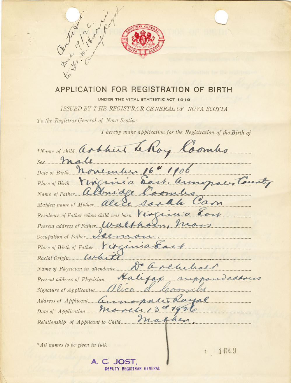 I hereby make application for the Registration of Birth of Arthur LeRoyCoombs Sex Male
