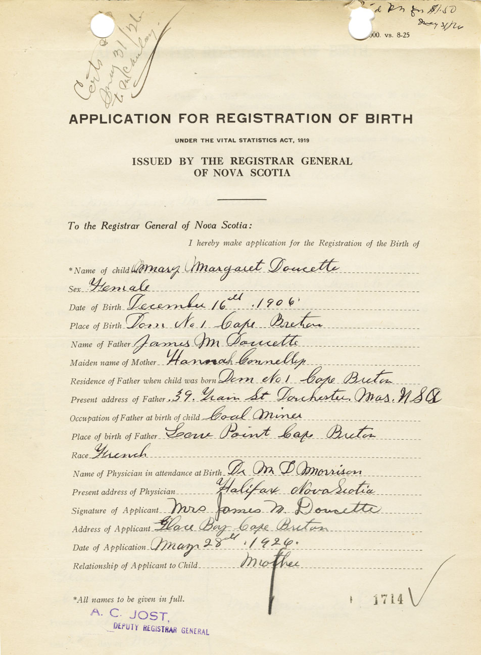 Date of Birth December 16, 1906 Place of Birth DominionCounty of Cape Breton