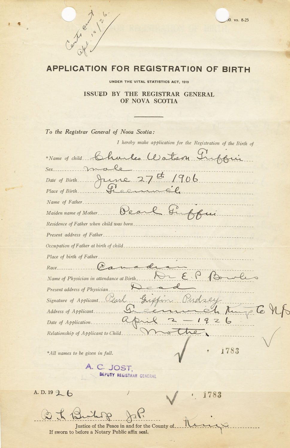 I hereby make application for the Registration of Birth of Charles WatsonGriffin Sex Male