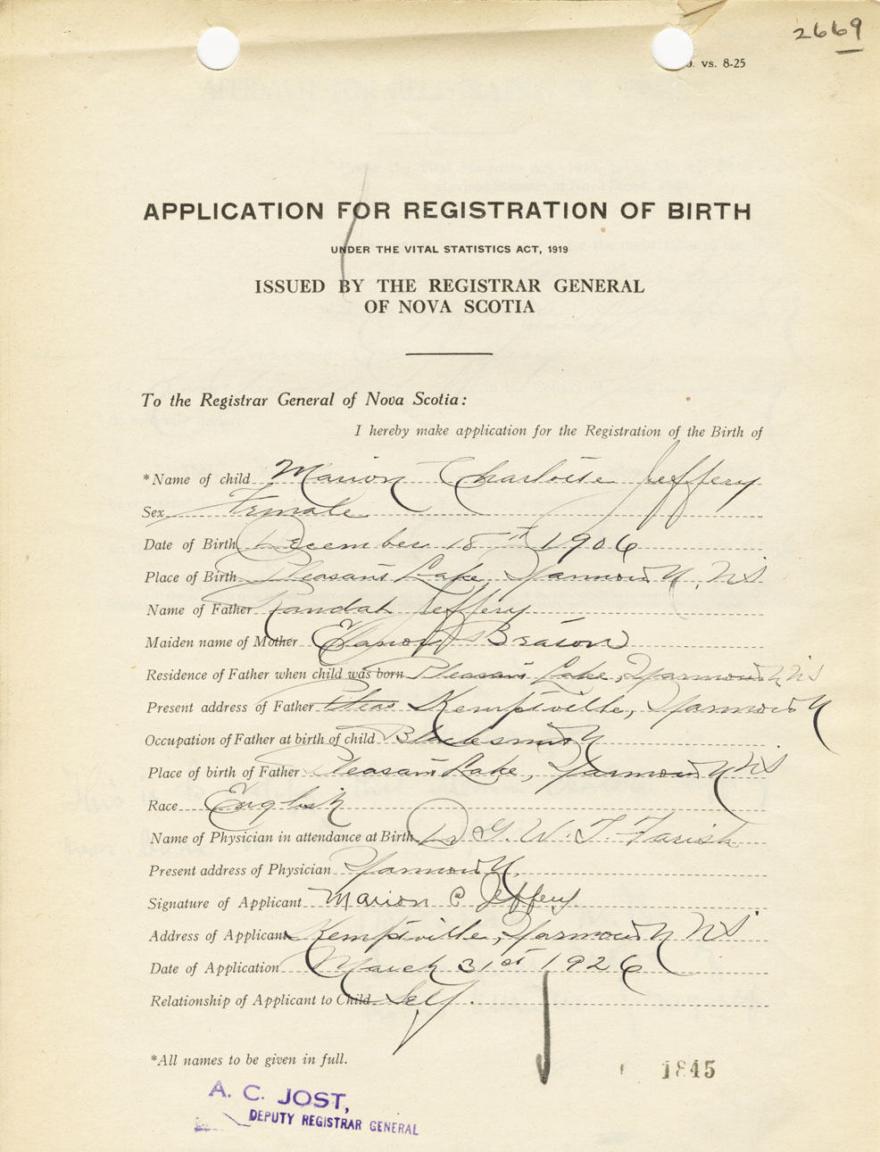 I hereby make application for the Registration of Birth of Marion CharlotteJeffrey Sex Female