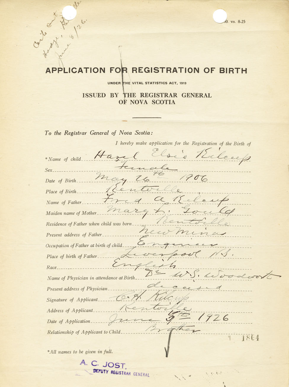 Signature of Applicant C.H. Kilcup Address of Applicant Kentville Date 5 June 1926