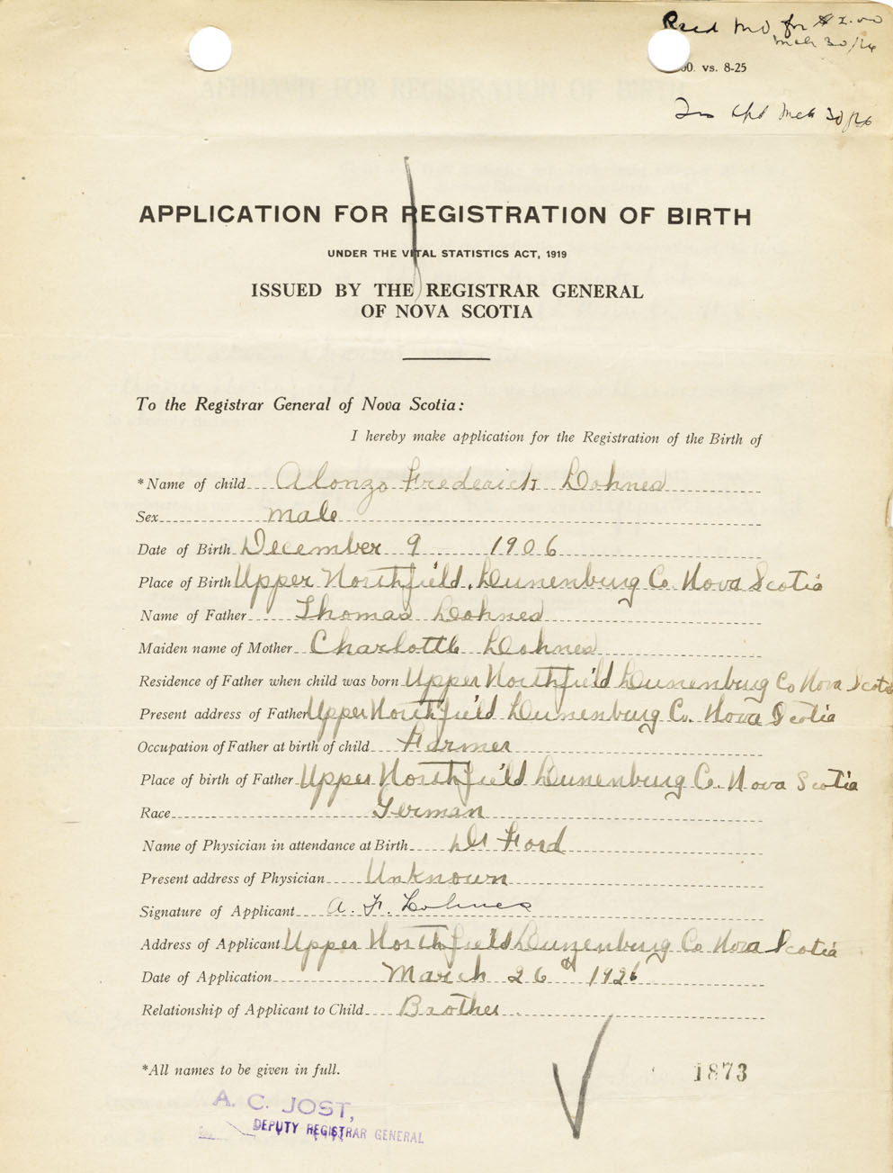 I hereby make application for the Registration of Birth of Alonzo FrederickLohnes Sex Male