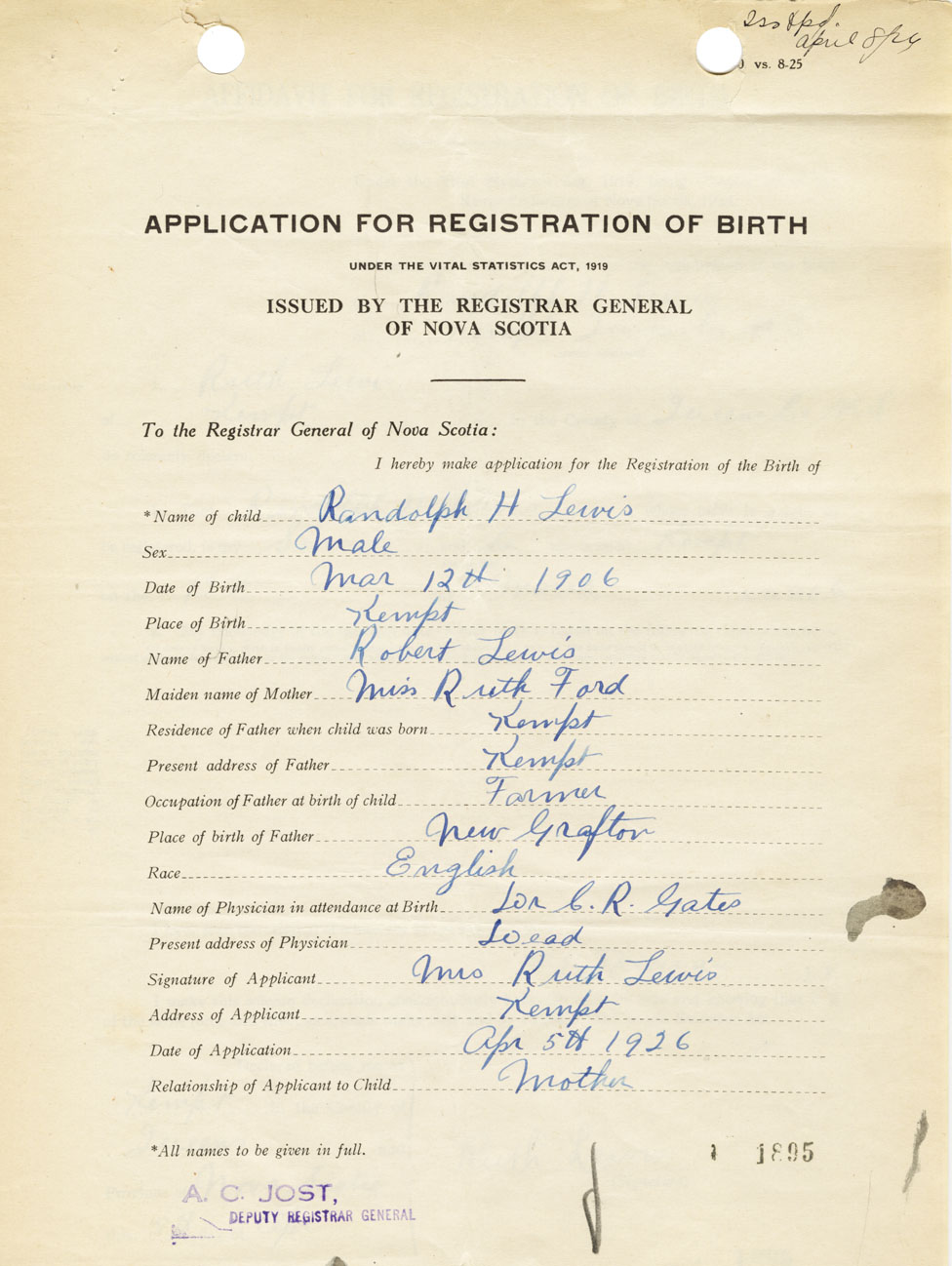 I hereby make application for the Registration of Birth of Randolph H.Lewis Sex Male