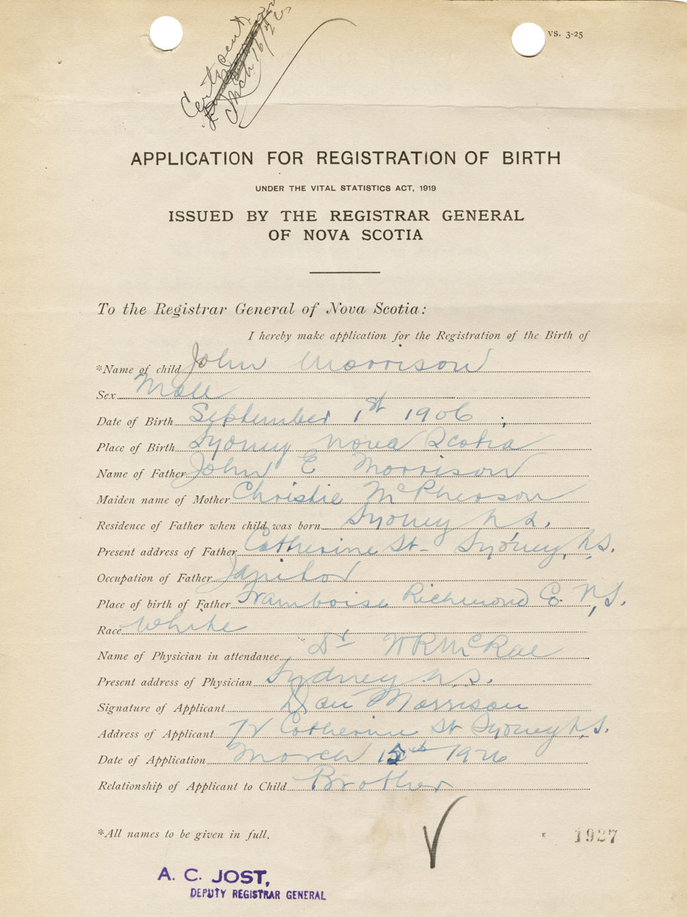 Date of Birth September 1, 1906 Place of Birth SydneyCounty of Cape Breton