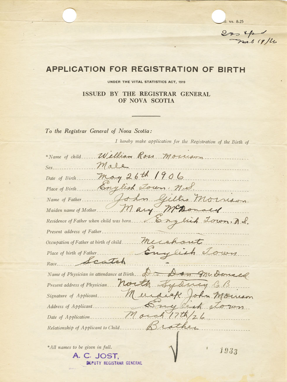Signature of Applicant Murdock John Morrison Address of Applicant Englishtown Date 17 March 1926