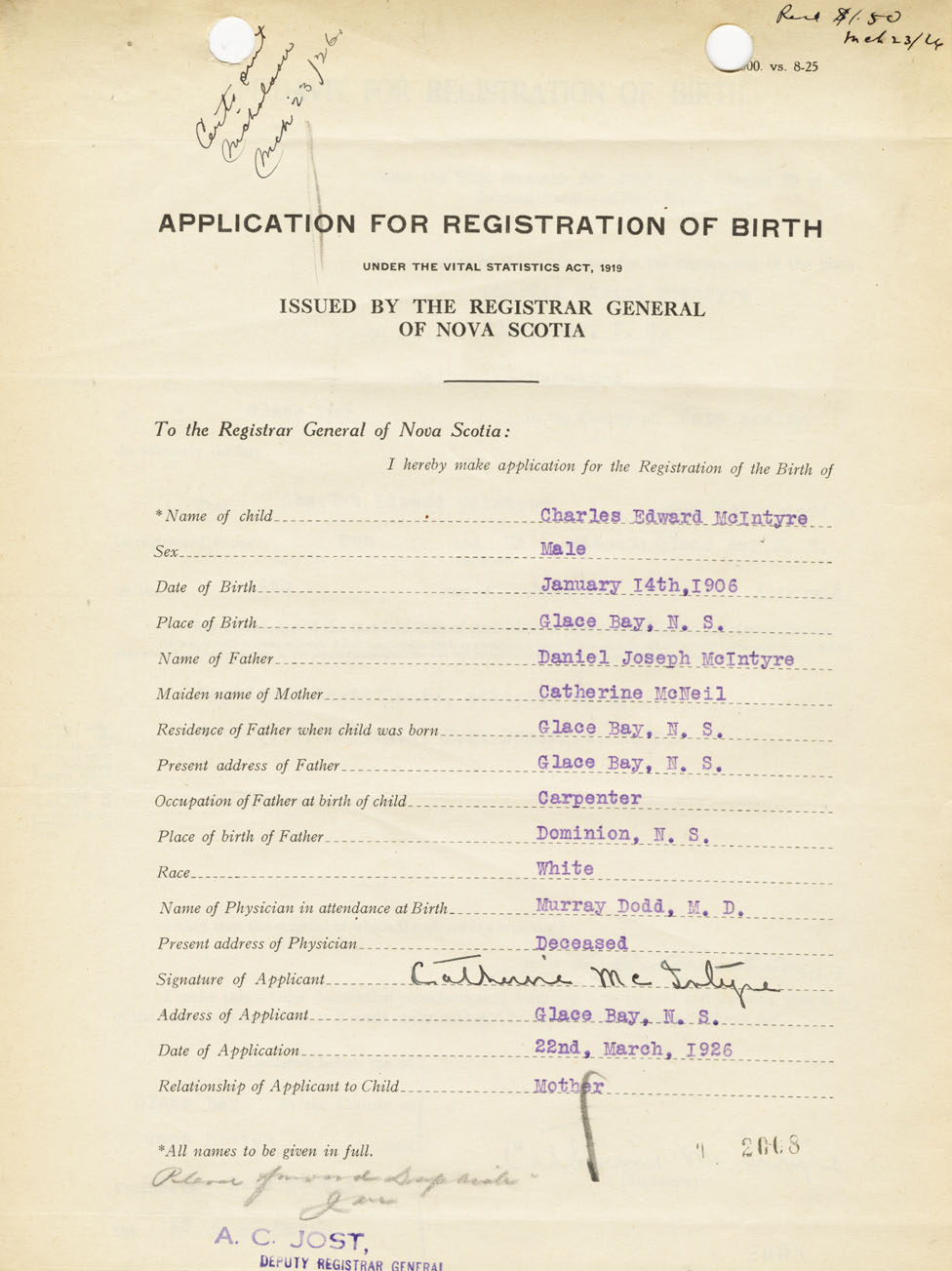 Signature of Applicant Catherine McIntyre Address of Applicant Glace Bay Date 22 March 1926