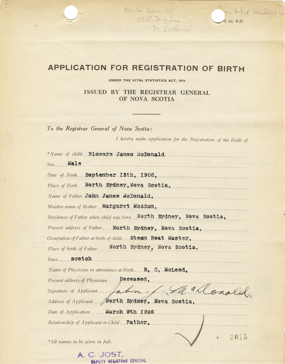Date of Birth September 13, 1906 Place of Birth North SydneyCounty of Cape Breton