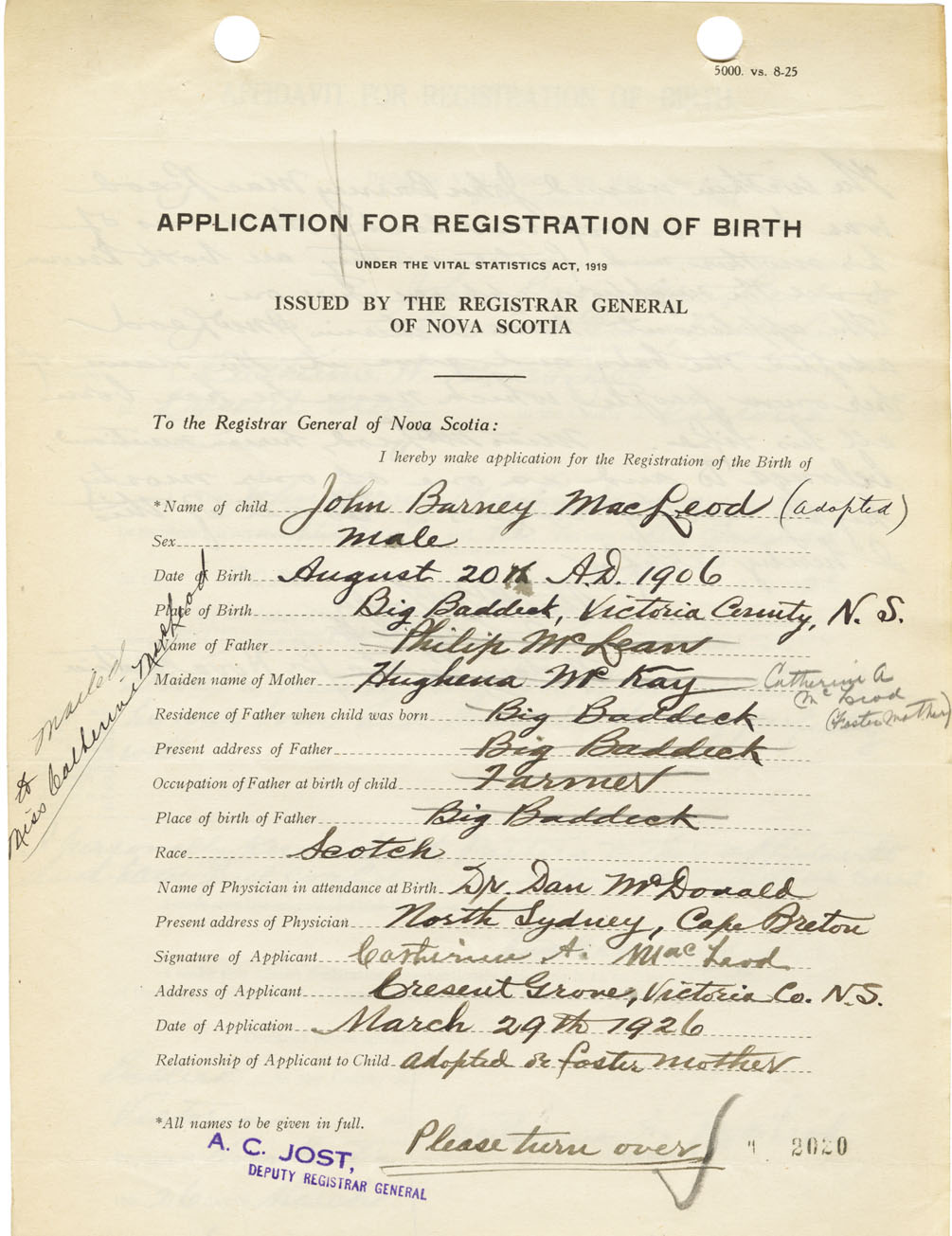 I hereby make application for the Registration of Birth of John BarneyMacLeod Sex Male
