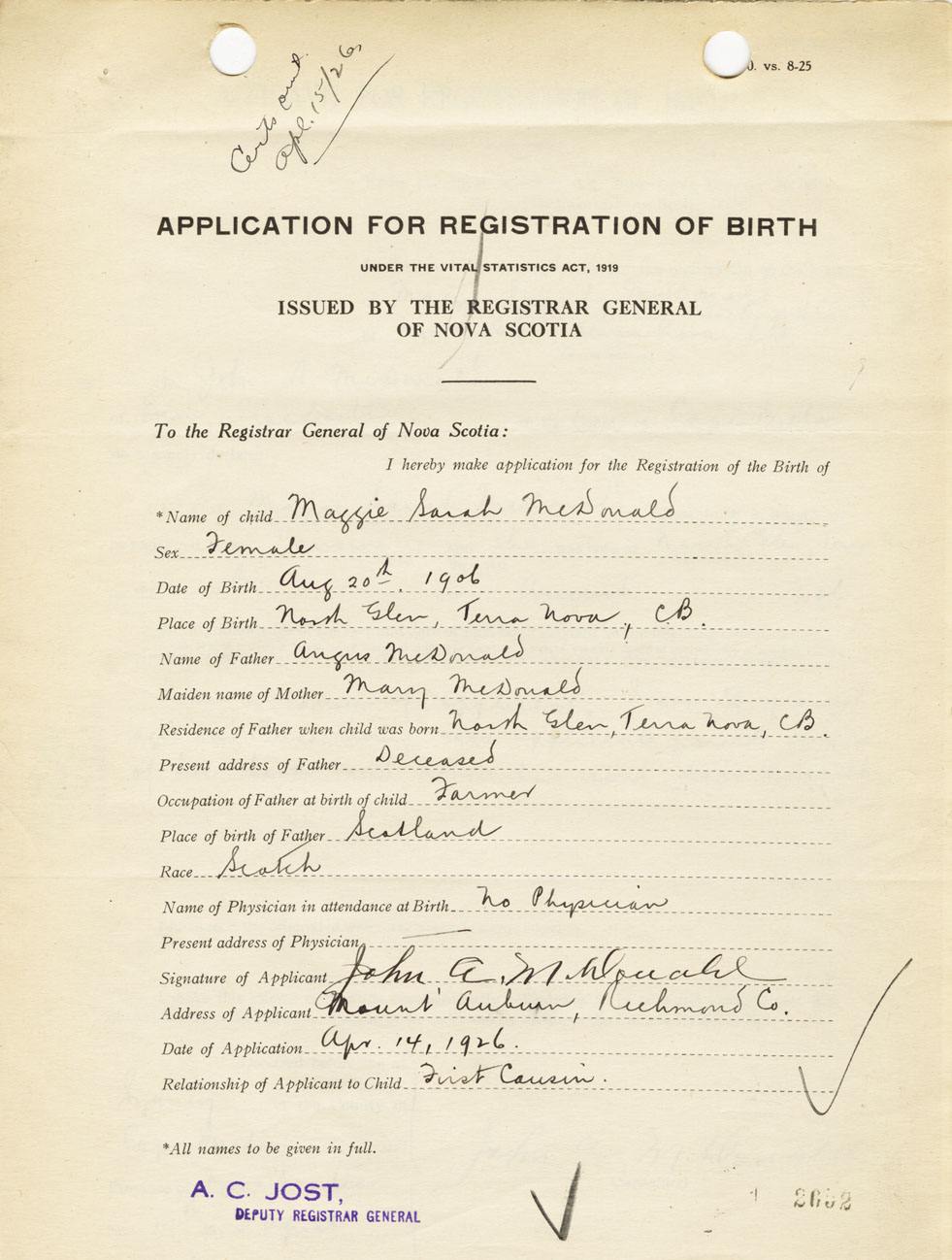 IN THE MATTER of the application for the Registration of the Birth of Maggie SarahMcDonald