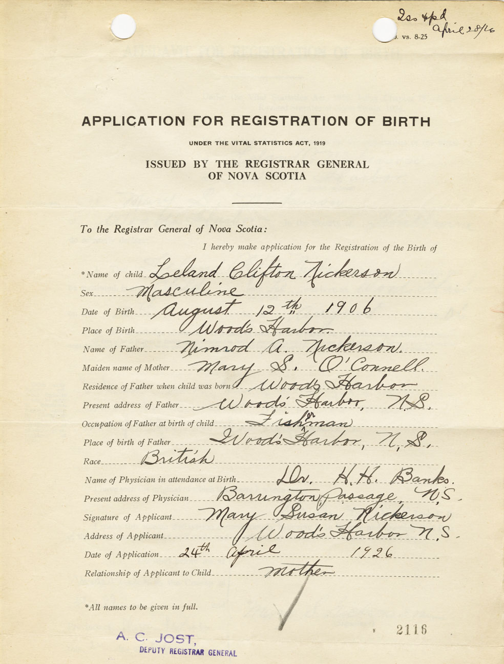 Date of Birth August 12, 1906 Place of Birth Woods HarbourCounty of Shelburne