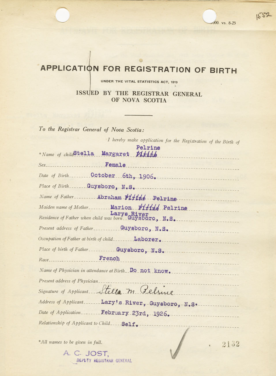 Signature of Applicant Stella Margaret Pelrine Address of Applicant Lary's River Date 23 February 1926