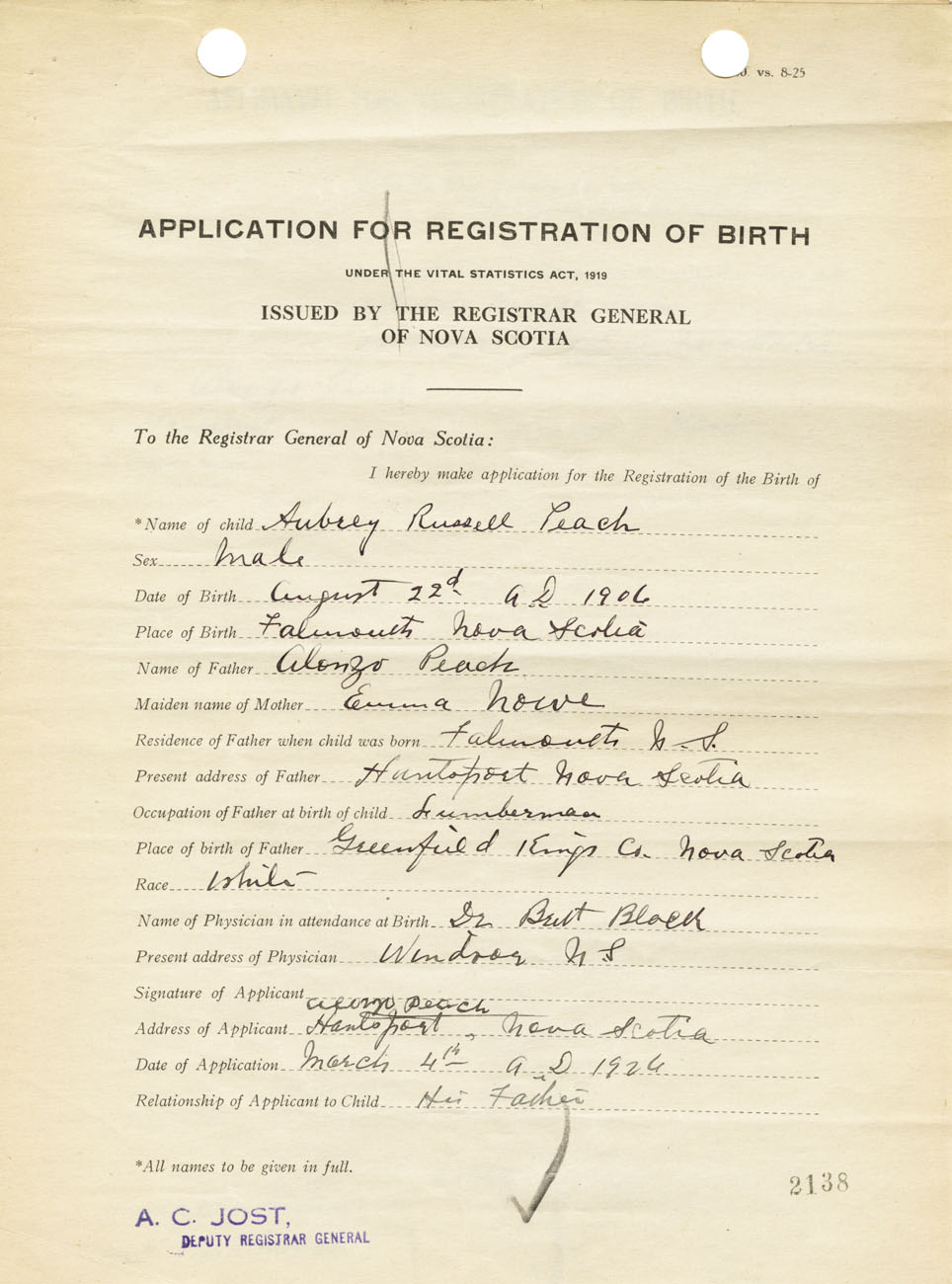 Signature of Applicant Alonzo Peach Address of Applicant Hantsport Date 4 March 1926