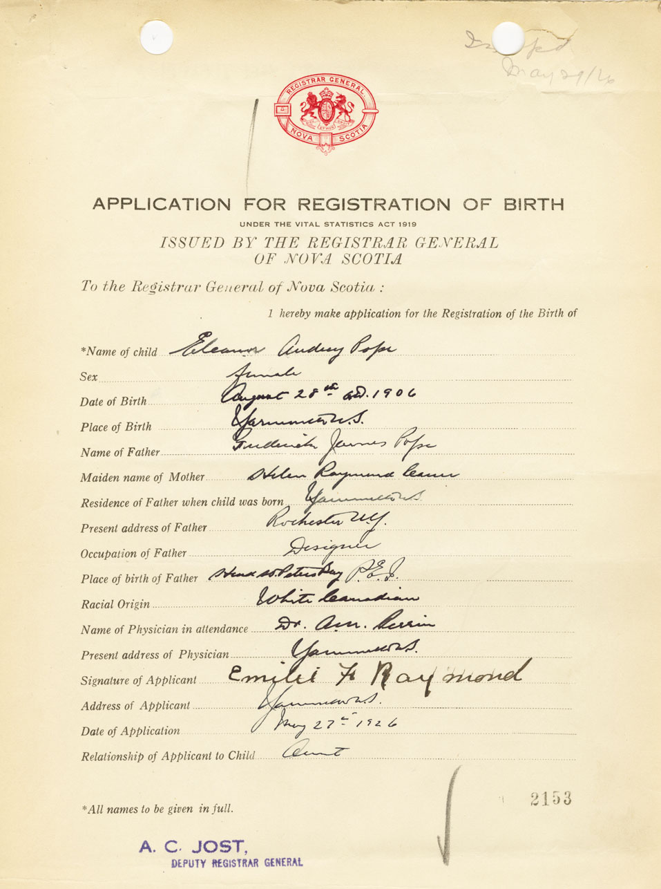 Date of Birth August 28, 1906 Place of Birth YarmouthCounty of Yarmouth