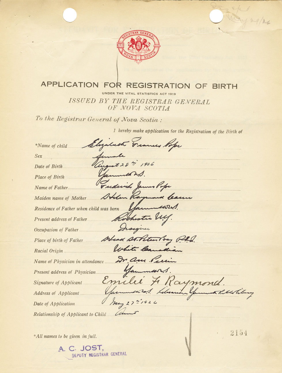 IN THE MATTER of the application for the Registration of the Birth of Elizabeth FrancisPope