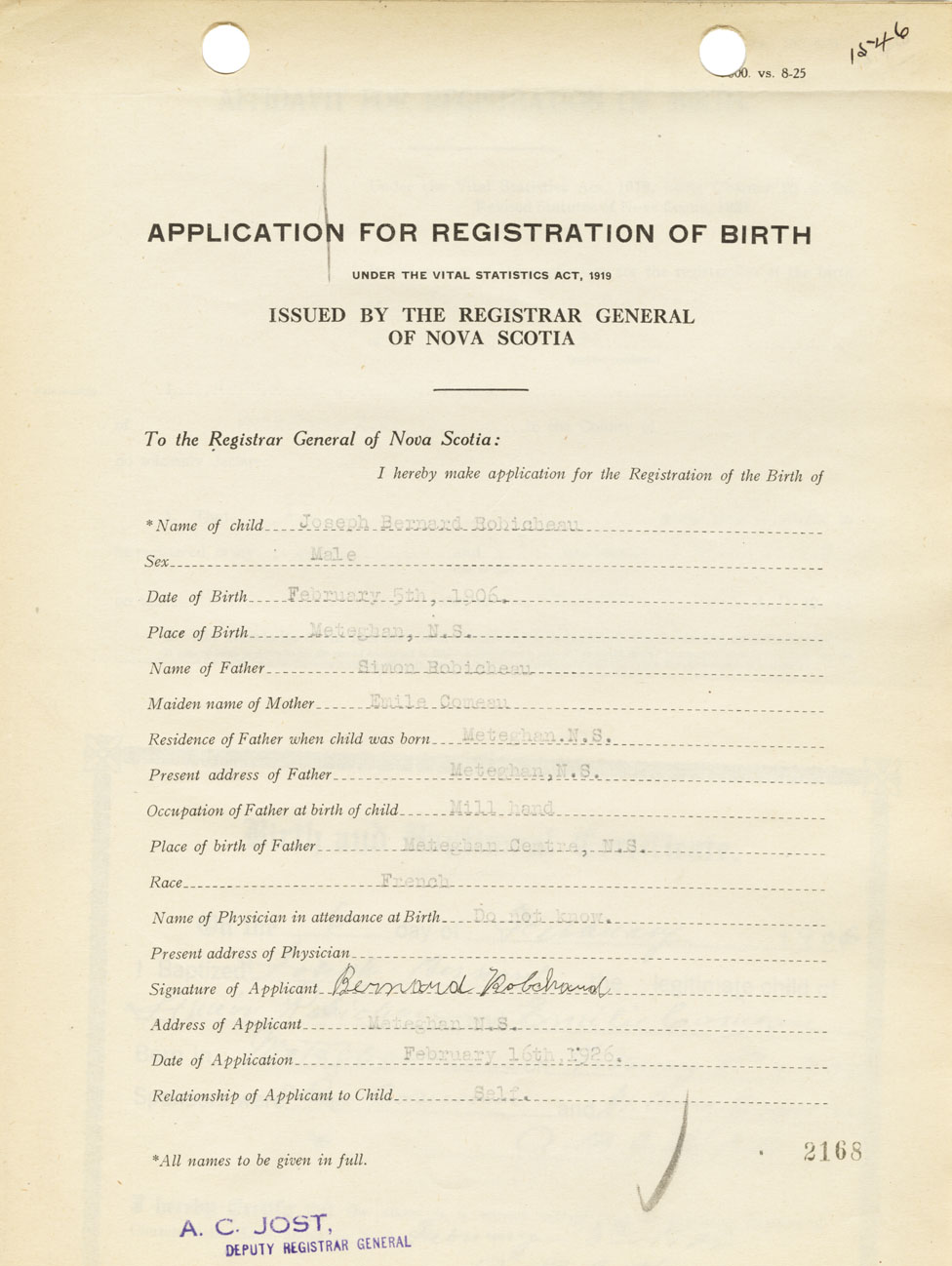 Signature of Applicant Bernard Robicheau Address of Applicant Meteghan Date 16 February 1926