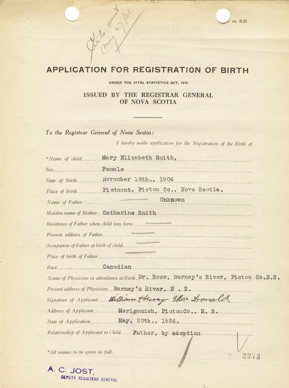 Date of Birth November 18, 1906 Place of Birth PiedmontCounty of Pictou