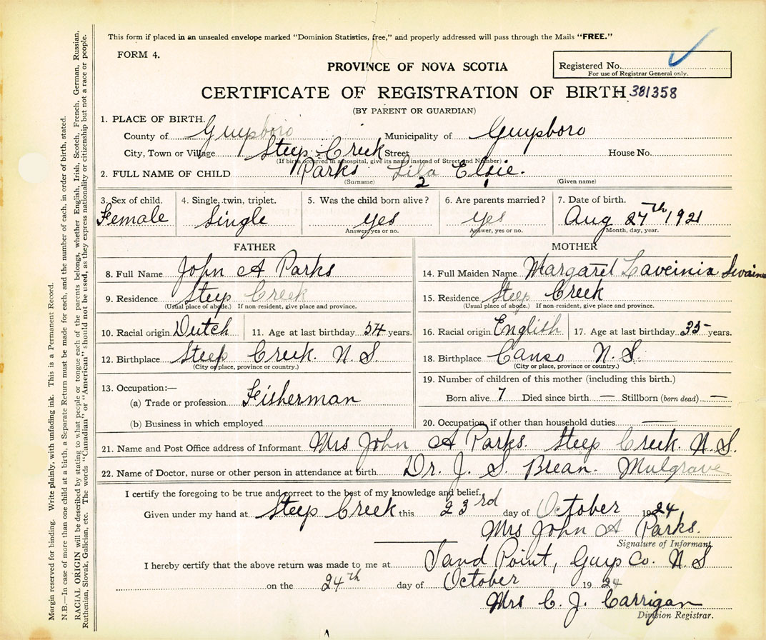 21. Name and Post Office address of Informant Mrs. John A. Parks Steep Creek, N.S.