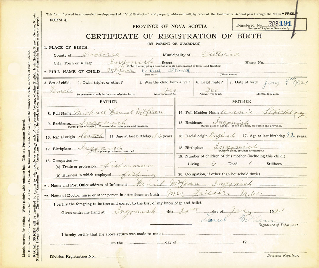 21. Name and Post Office address of Informant Daniel McLean Ingonish