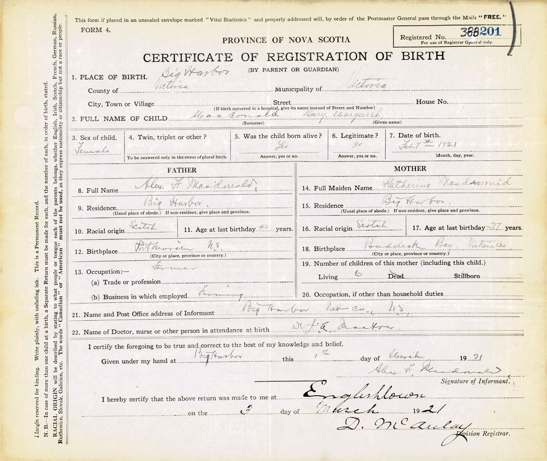 21. Name and Post Office address of Informant Alex F. Macdonald Big Harbor, Vict. Co., N.S.