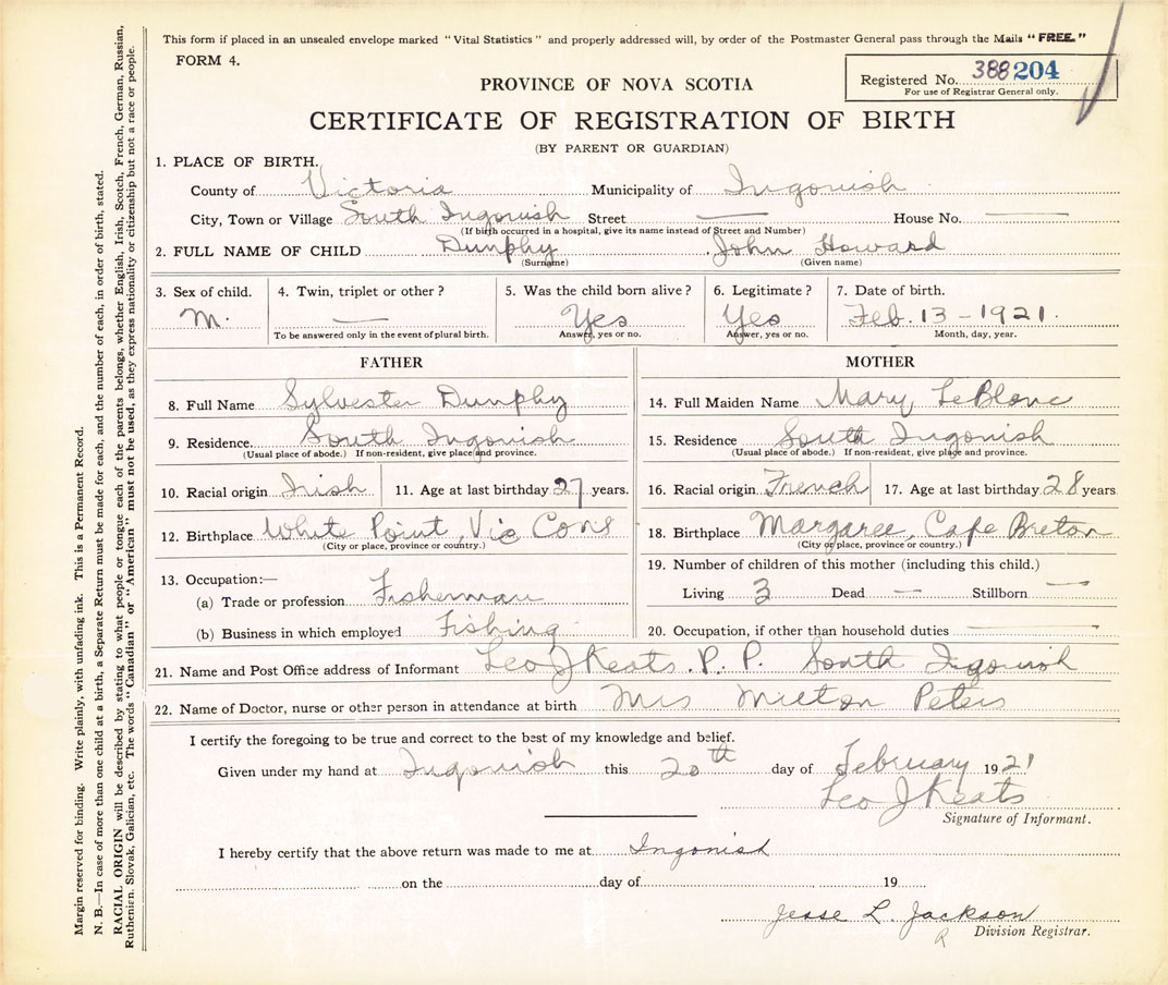 21. Name and Post Office address of Informant Leo J. Keats South Ingonish