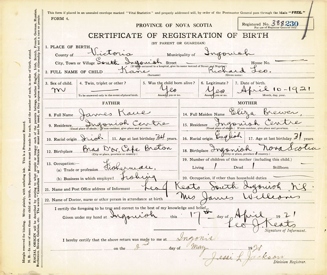 21. Name and Post Office address of Informant Leo J. Keats South Ingonish