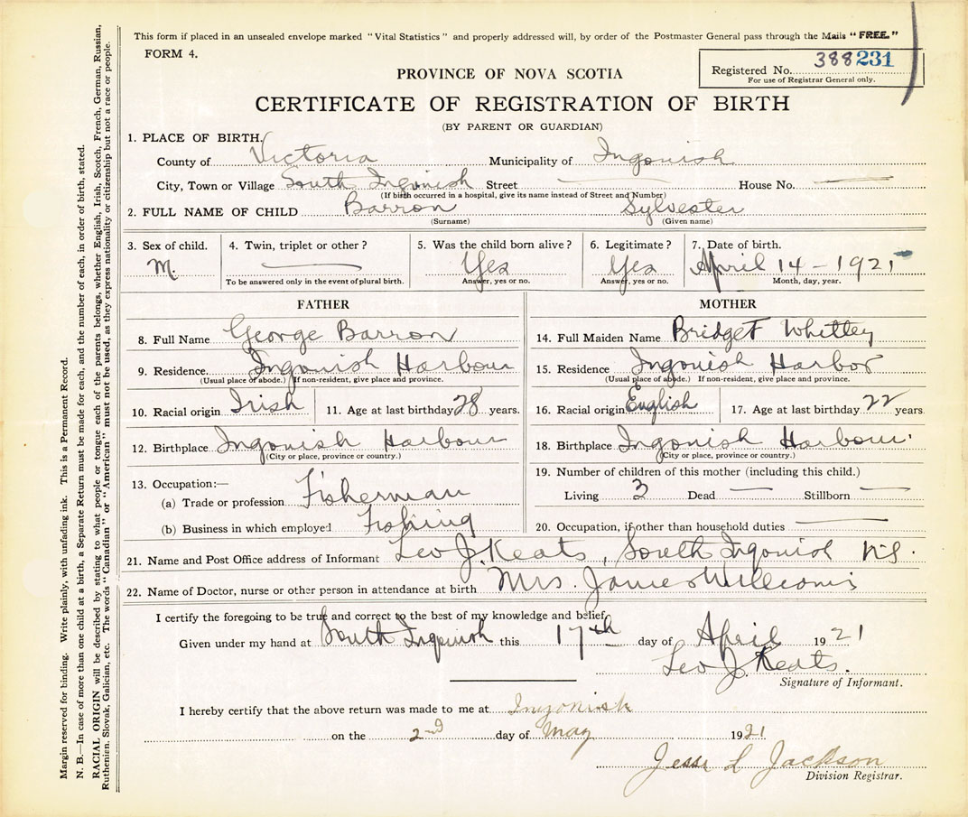 21. Name and Post Office address of Informant Leo J. Keats South Ingonish