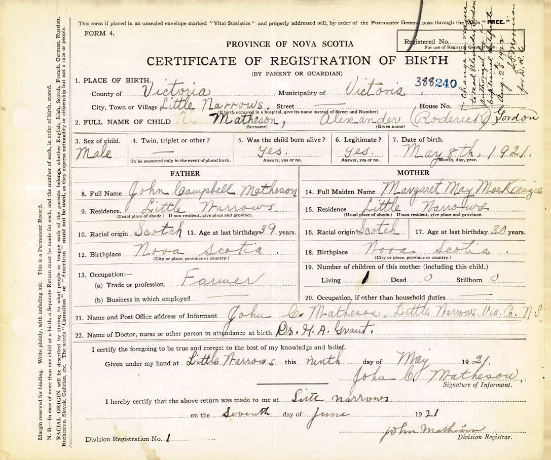 21. Name and Post Office address of Informant John C. Matheson Little Narrows, Vic. Co., N.S.
