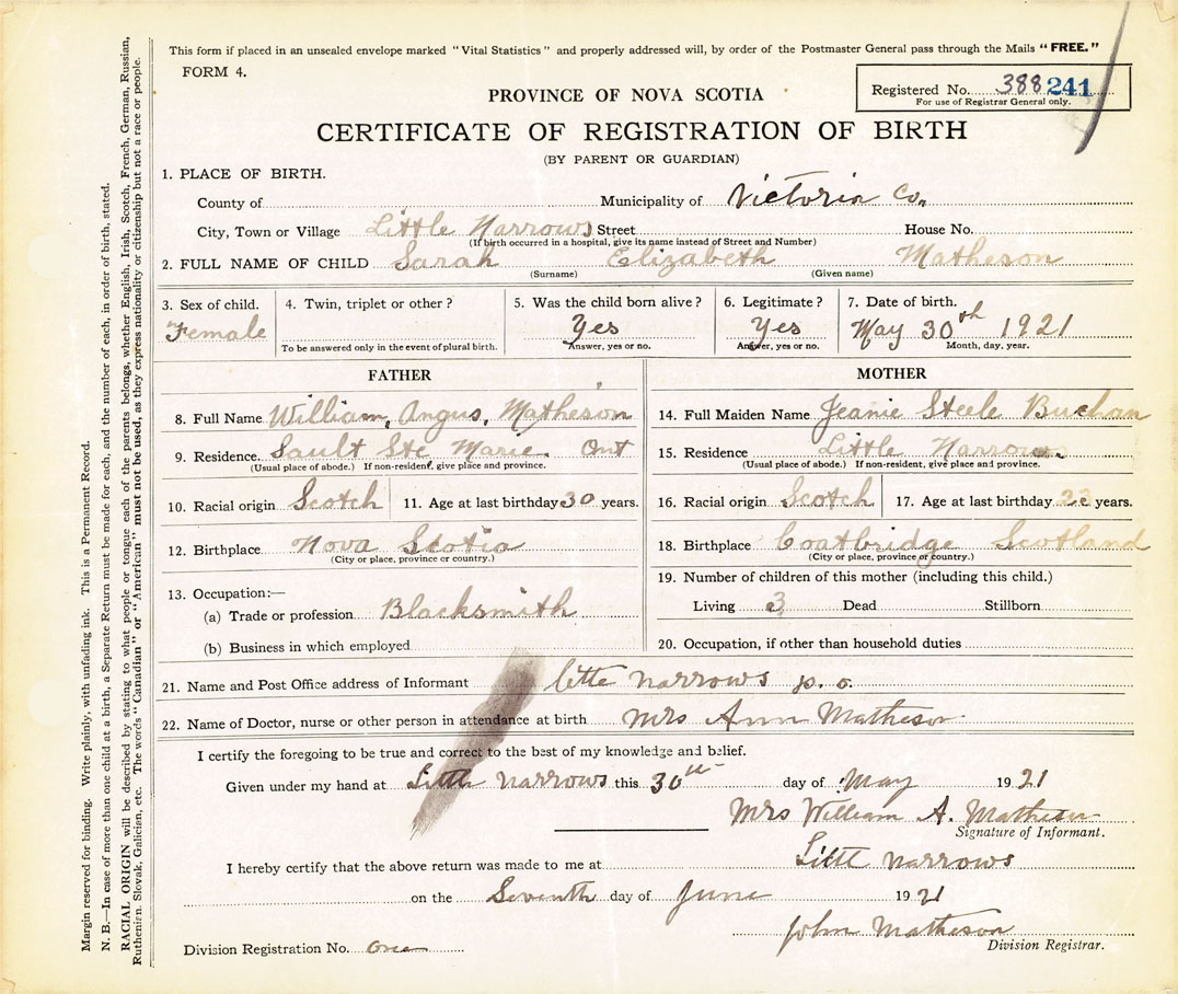 21. Name and Post Office address of Informant Mrs. William A. Matheson Little Narrows P.O.