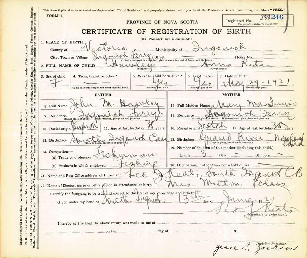 21. Name and Post Office address of Informant Leo J. Keats South Ingonish, C.B.